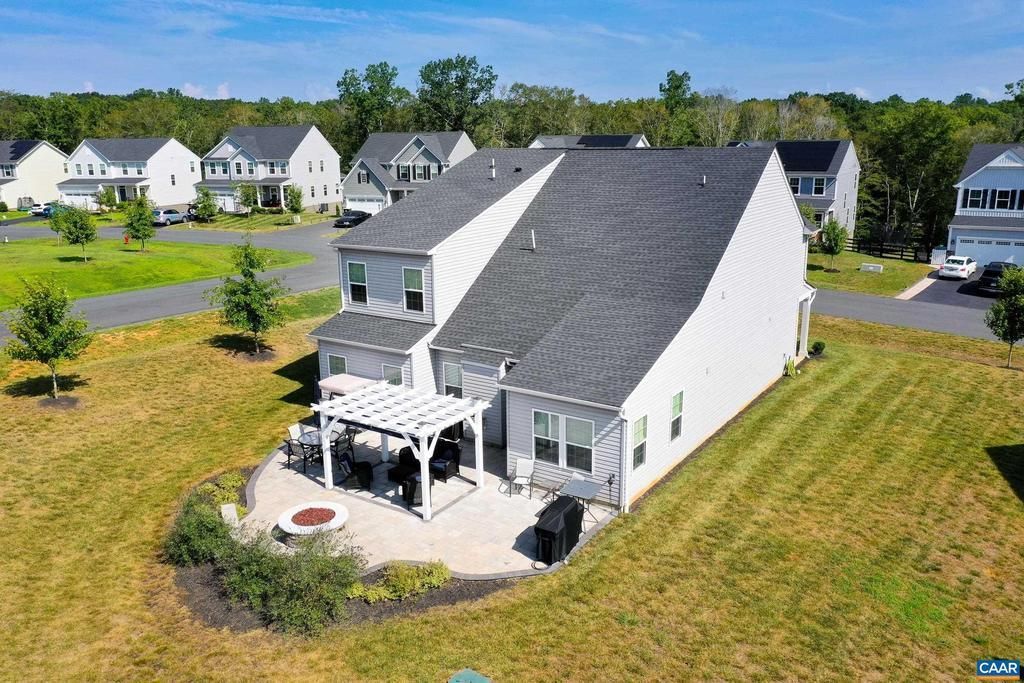 This move-in-ready Craftsman-style home in Palmyra, Virginia offers the ease of main-level primary living in Fluvanna County. The open-concept layout features luxury vinyl plank flooring throughout common areas, upgraded carpet in all bedrooms, and a dedicated home office with French glass doors for privacy. The gourmet kitchen is designed for entertaining with white cabinetry, quartz countertops, a navy subway tile backsplash, large island with seating (stools included!) walk-in pantry, and stainless appliances. The great room centers around a cozy gas fireplace with a sunny breakfast nook nearby. The primary suite features a tray ceiling, sitting area, huge walk-in closet, and a spa-style ensuite with double-sink vanity and frameless glass, tiled shower. Upstairs, a spacious loft serves as a playroom or media room alongside three additional bedrooms with generous closets and a shared full bath. Outdoor living shines with a large patio, gas firepit, and a pergola with retractable awning, perfect for year-round entertaining. A two-car garage and unfinished storage area complete this exceptional Fluvanna County property just minutes from Lake Monticello, Charlottesville, and US-15.,Quartz Counter,White Cabinets,Fireplace in Great Room